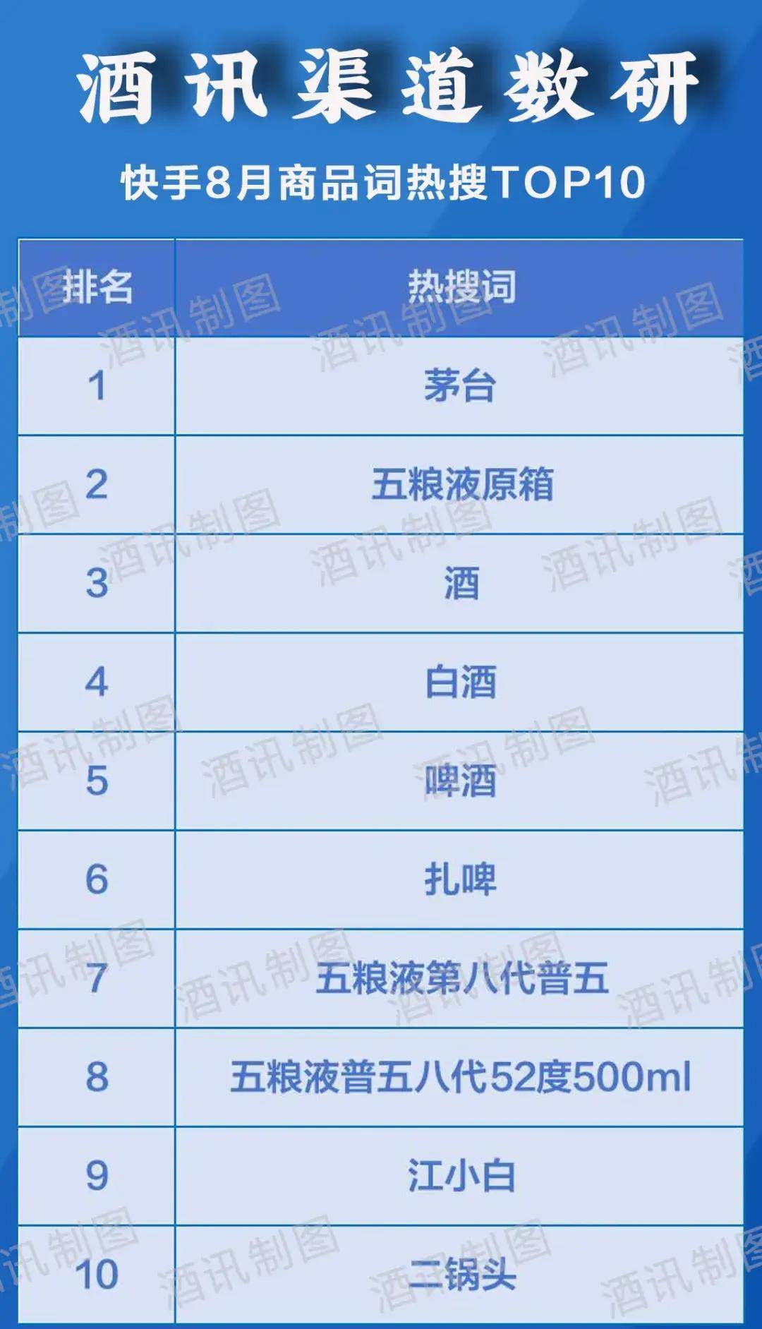 就热销SKU所呈现的特征来看,该平台消费者对名酒品牌的需求并不弱。飞瓜数据统计的快手8月酒类商品热搜词也佐证了这一点,其中茅台、五粮液在TOP 10热搜词中排名靠前,另有“江小白”“二锅头”“白酒”等热词同样是平台消费者的重点关注对象。